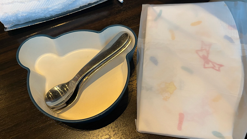 子ども用カトラリーとエプロンももらえました。