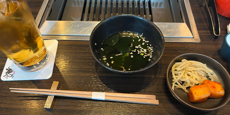 まずわかめスープとキムチ・ナムル。