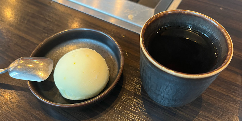 食後のシャーベットと温かいお茶。